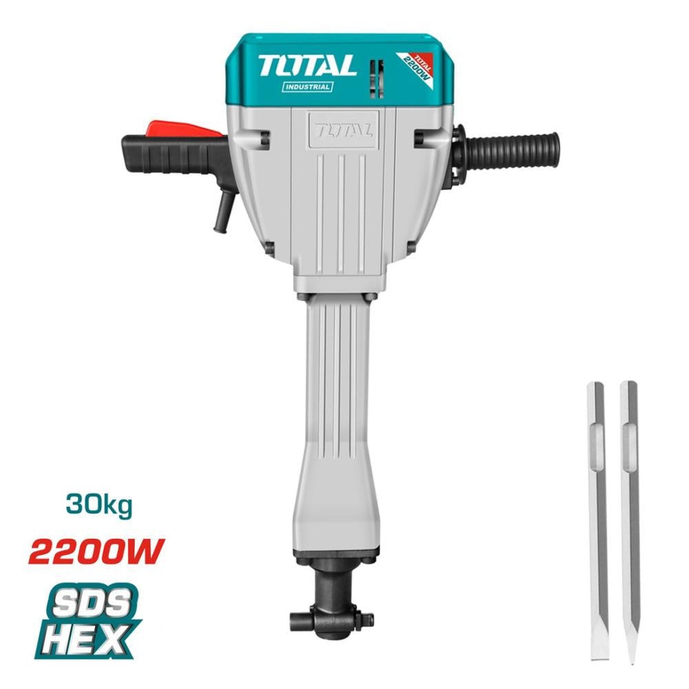 همر تكسير 2200 وات 30 كجم من توتال تولز ، مطرقة هدم وتكسير30 كجم 2200 وات ، معدل مرتفع في إزالة الخامات بفضل قوة طرق مفردة ، اهتزازت ضئيلة بفضل خاصية امتصاص الاهتزاز(AVT) لإتاحة مدة تشغيل أطول ، عمر افتراضي طويل للغاية بفضل المكونات عالية الجودة المصنوعة من الألومنيوم والفولاذ ، فرش الكربون للتوقف التلقائي ، ظرف نظام HEX ، كابل طاقة بطول 4 متر.