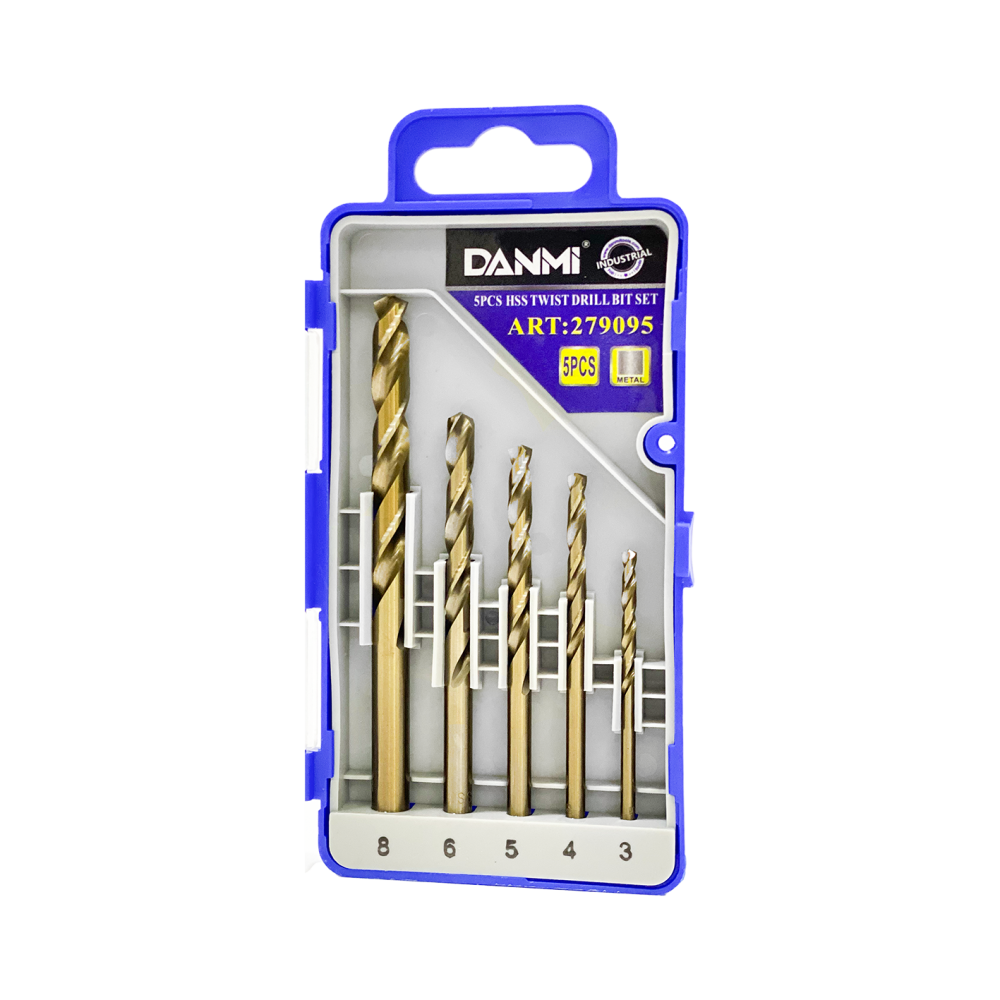 طقم ريش حديد HSS 5 قطع من دانمي – موديل 279095 مصمم للحفر الدقيق في المعادن والحديد والسبائك. مصنوع من فولاذ عالي السرعة (HSS) مطلي بالتيتانيوم لمقاومة التآكل وزيادة العمر الافتراضي. الطقم يشمل مقاسات متعددة تناسب مختلف الاستخدامات المهنية والمنزلية، مع علبة منظمة لحفظ الريش بشكل آمن وعملي.